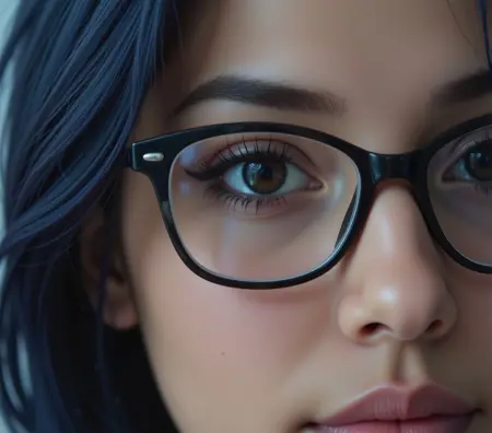 woman, dark eyes, dark blue hair, puffy hair, medium hair,
