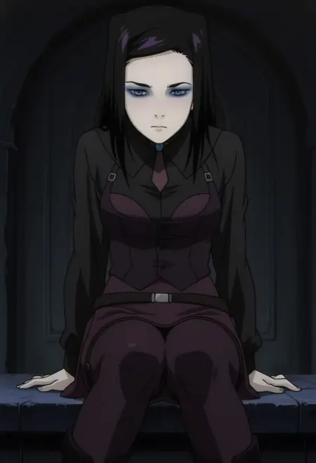 relMayer, black hair, long hair, bangs, pale skin, blue eyes, makeup, blue eyeshadow, black eyeliner, anime screenshot, anime screencap