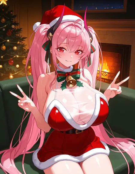 - red eyes, demon horns, ahoge, pink hair, very long hair, ribbon, hair ornament, twintails