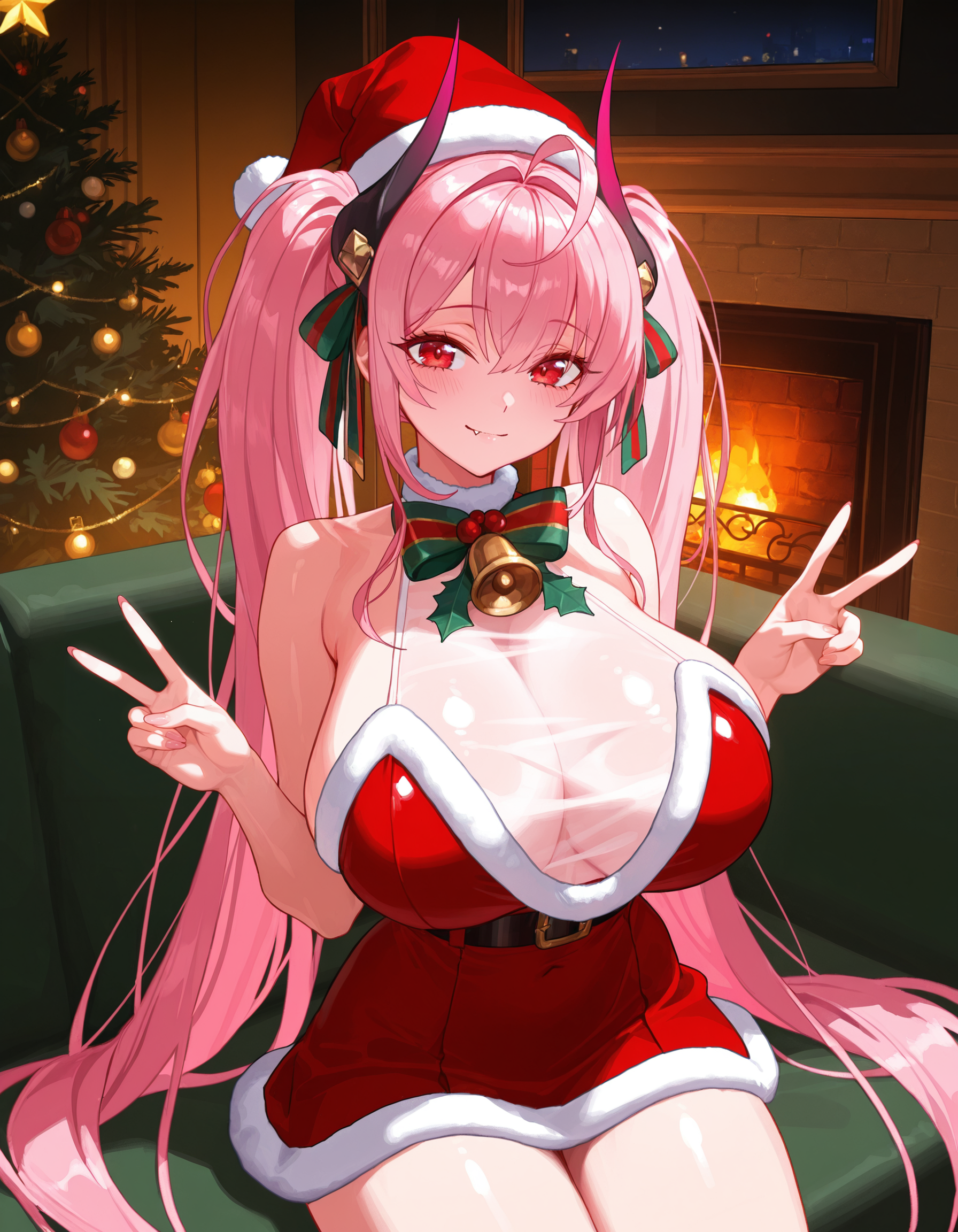 - 빨간 눈, 악마 뿔, 아호게, 분홍색 머리, 매우 긴 머리, 리본, 머리 장식, 트윈테일