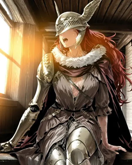 Appearance: M4l3n14, 1girl, red hair, very long hair, closed eyes, scar*