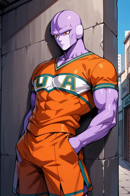 hit, 1boy, alien, purple skin, bald, red eyes, no eyebrows, muscular male