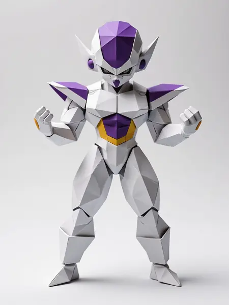 최종 형태의 프리제를 종이접기 스타일로 표현한 캐릭터 모델, 위협적인 자세, 차가운 색조, 각진 주름.