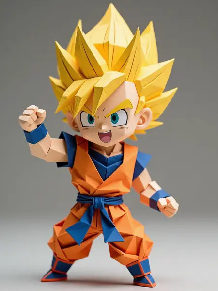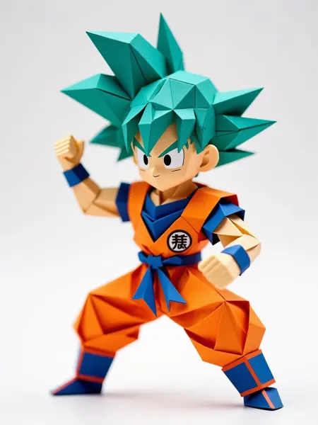 초사이어인 블루의 고쿠를 종이접기 스타일로 표현한 캐릭터 모델, 역동적인 자세, 밝은 색상, 날카로운 주름.