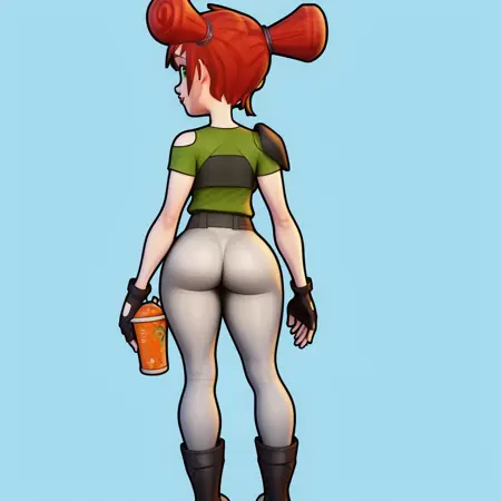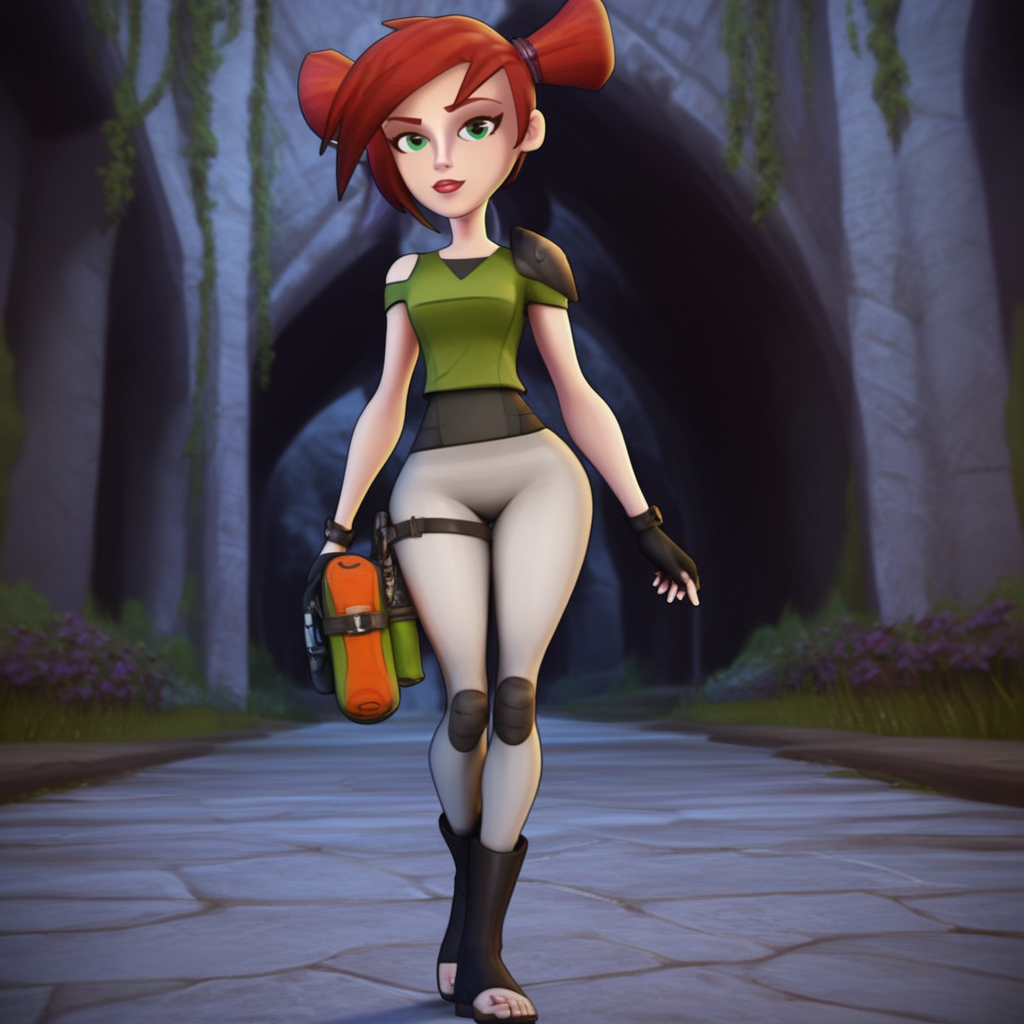 red hair, twin tails, red lips, green eyes, slim, grey pants, green shirt, sleeveeless shirt, thight pants