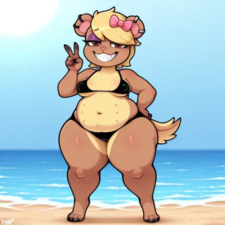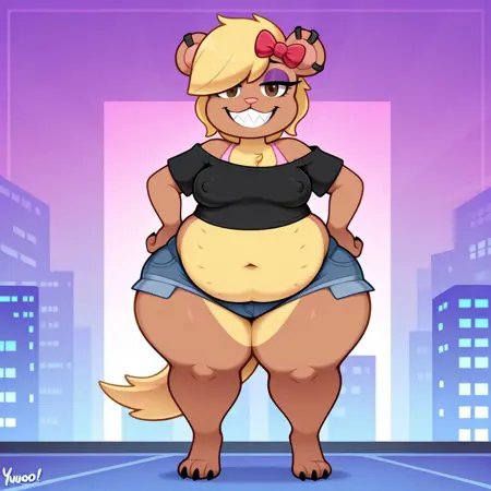 | 학습된 단어 | yungoos, mongoose, pokemon (species), brown and yellow fur, sharp teeth, pink nose, purple eyeshadow, brown eyes, short thick tail, mongoose ears, ear piercings, short blonde hair, side-swept bangs, red hair bow, black claws, chubby, thick thighs, belly nipples, medium breasts,복사됨! |