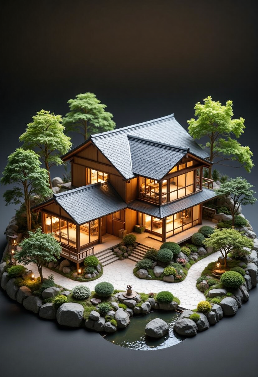 Miniature Japanese - style house models Miniature Japanese - style house models, featuring curved roof lines, neatly trimmed bonsai, wooden decks, and softly lit interiors, set in a mossy garden.