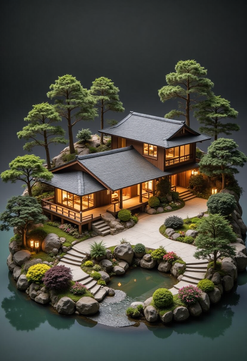 Miniature Japanese - style house models Miniature Japanese - style house models, placed on a tiny island, with winding streams, pine trees, and lanterns along the shore, reflecting traditional aesthetics.