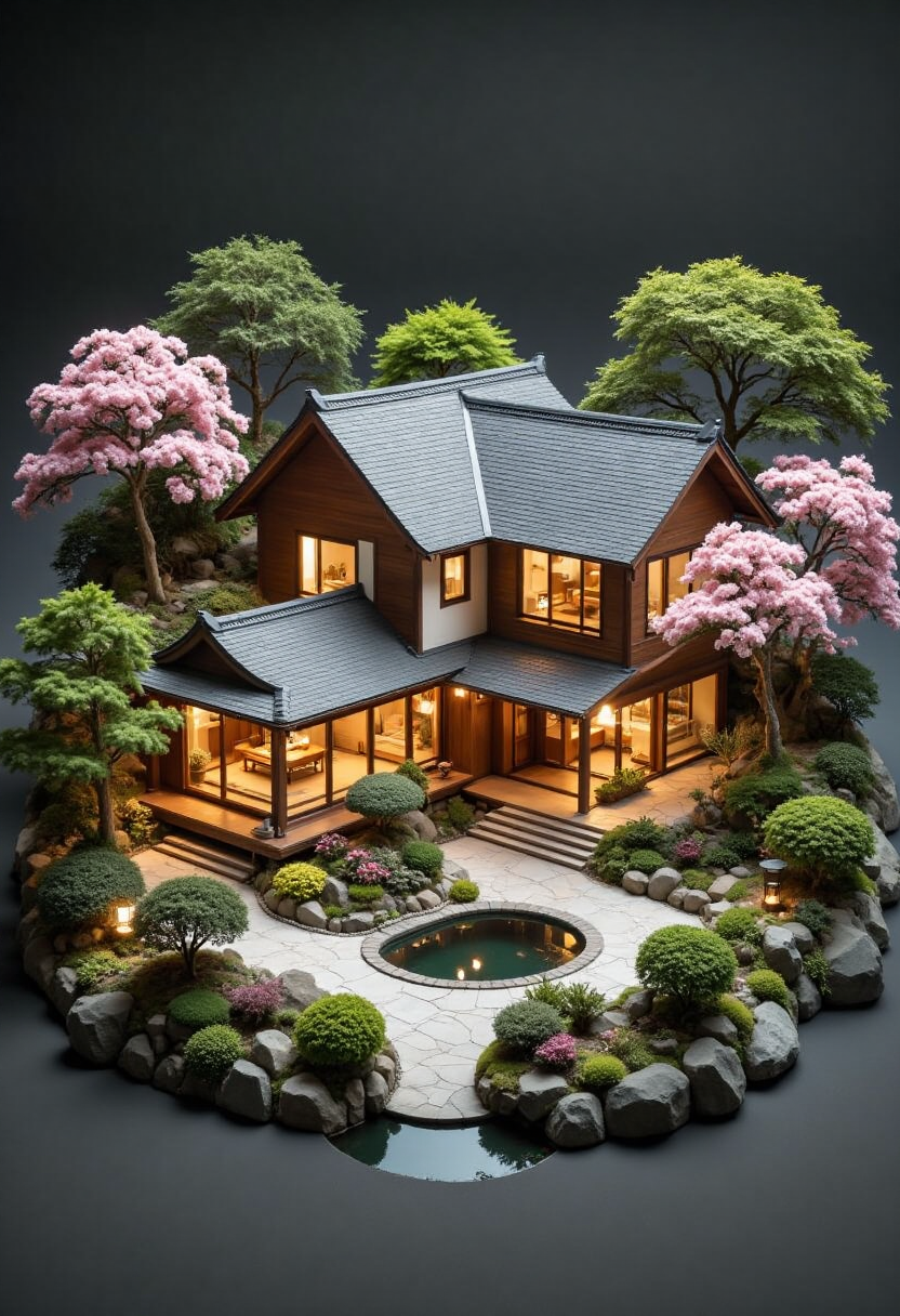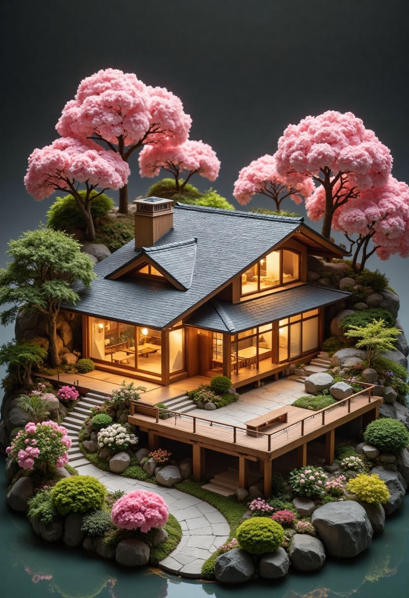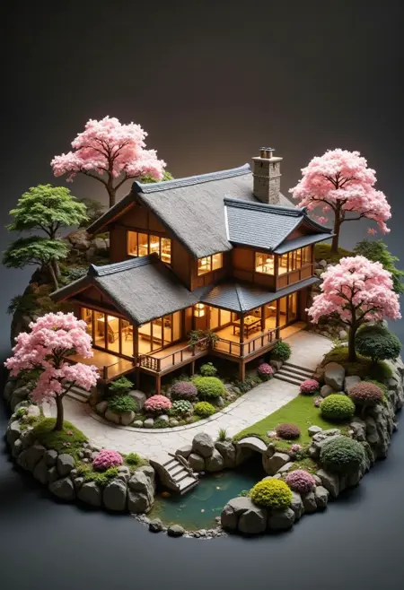 Miniature Japanese - style house models Miniature Japanese - style house models, surrounded by cherry blossom trees, with stone paths and small ponds, warm light glowing from windows, creating a tranquil evening scene.