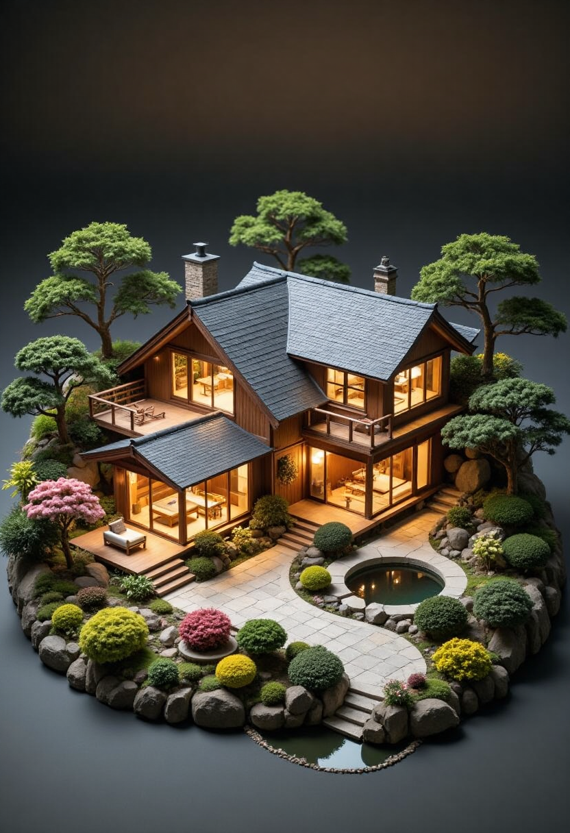 It has excellent scene construction capabilities and is suitable for creative scenarios such as Japanese-style miniature landscapes and house landscape design.