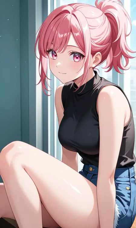 쇼코(세인티아 쇼), 1소녀, 혼자, 꼬리머리, 분홍색 눈, 분홍색 머리, 앞머리, 중간 크기 가슴, 허벅지, 캐주얼 복장, 셔츠, 소매 없음, 검은 셔츠, 소매 없는 셔츠, 청바지