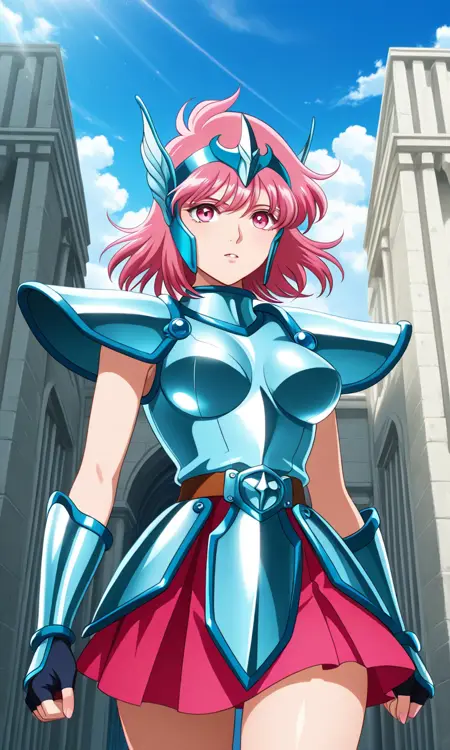 ショウコ(セイントア・ショウ)、1人の少女、単体、短い髪、ピンクの目、ピンクの髪、前髪、中程度の胸、太もも、エキュレウスの鎧、エキュレウスのヘルメット、スカート、手袋、指なし手袋、鎧