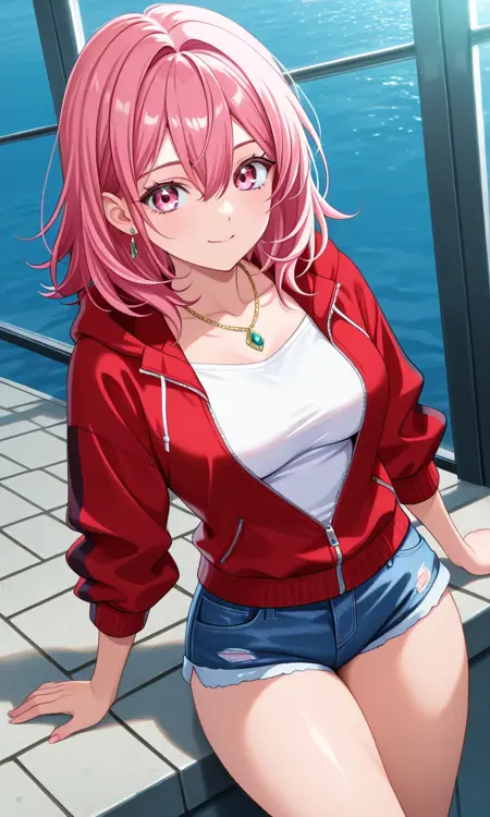 쇼코(세인티아 쇼), 1소녀, 혼자, 중간 길이 머리, 앞머리, 눈 사이 머리, 분홍색 머리, 분홍색 눈, 중간 크기 가슴, 허벅지, 분리형 복장, 보석, 후드, 목걸이, 후드티, 자켓, 빨간 자켓