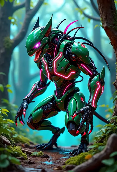 사이버펑크 로봇 캐릭터, 동물형 머리, 녹색 갑옷, 분홍 네온 정맥, 사이버 숲을 노리는 모습, 디지털 식물, 빛나는 눈, 포식자 같은 자세.