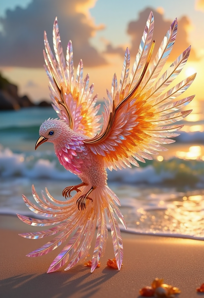 6. クリスタルのような質感を持つ鳥型のアート作品、夕暮れの砂浜の上を diving し、クリスタルの羽がオレンジとピンクの光を放ち、波が静かに打ち寄せる。