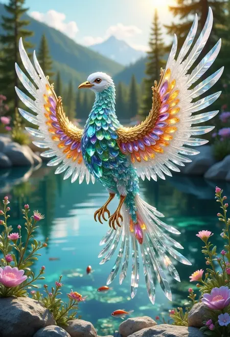 2. クリスタルのような質感を持つ鳥型のアート作品、日光に照らされた透き通る湖の上を飛び、水面に色とりどりのクリスタルの羽の反射が映し出され、その下では小さな魚が泳いでいる。