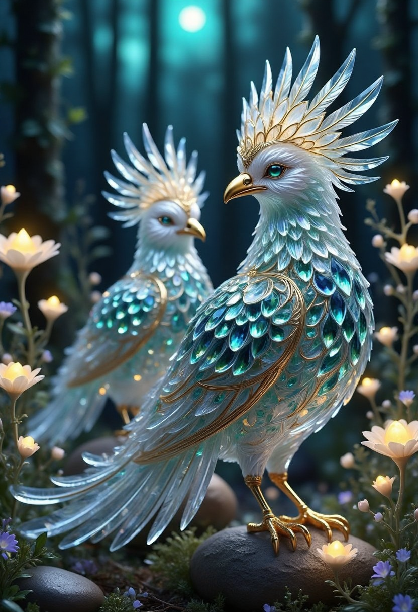1. クリスタルのような質感を持つ鳥型のアート作品、夜の霧に包まれた森に設置され、月光がクリスタルの羽に輝きを放ち、繊細で光るキノコに囲まれている。