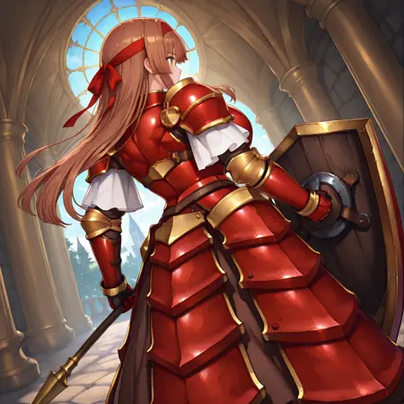 Default: Red Hairband, armored dress, red boots, red gauntlets