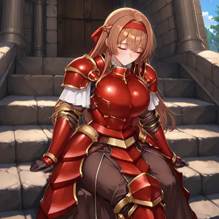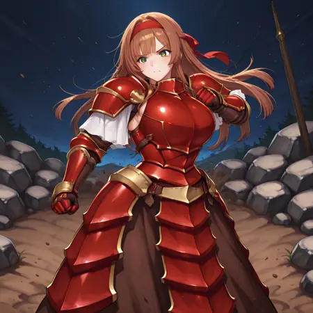 :红色发带,盔甲连衣裙,红色长靴,红色护腕