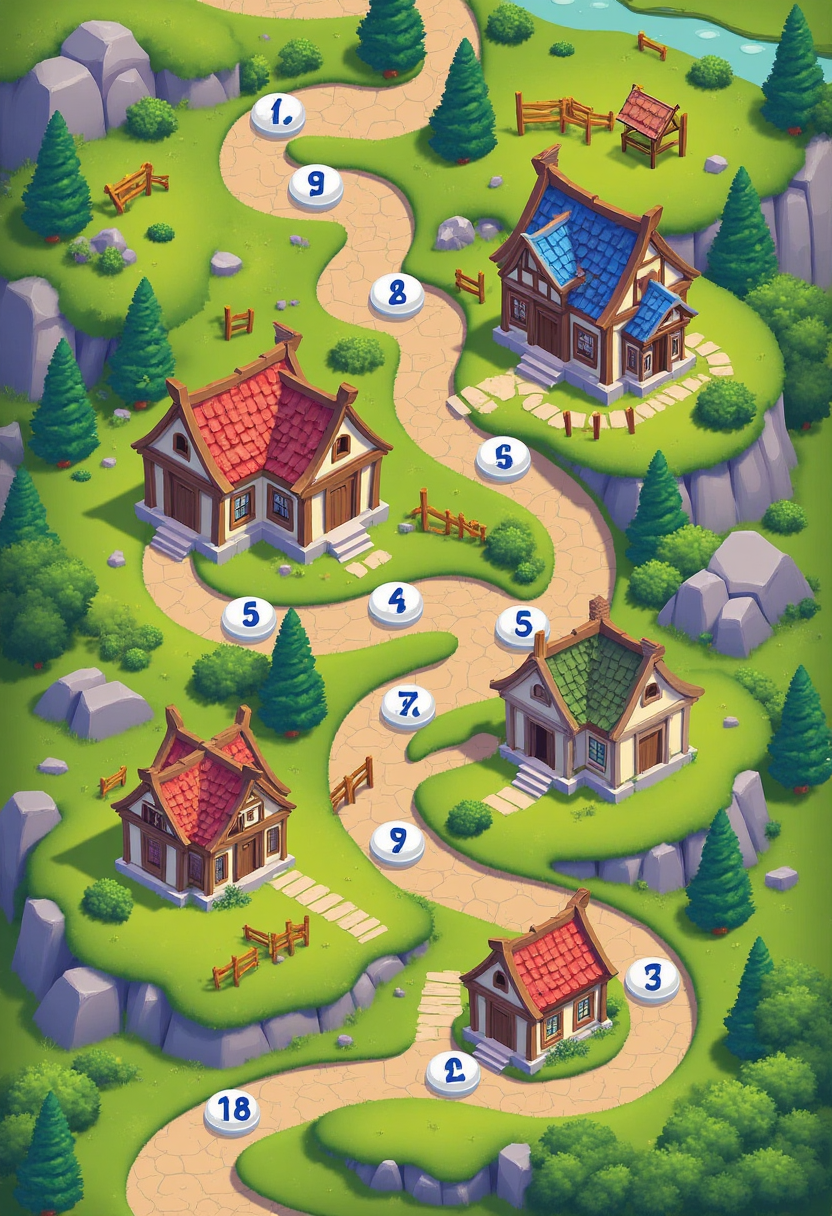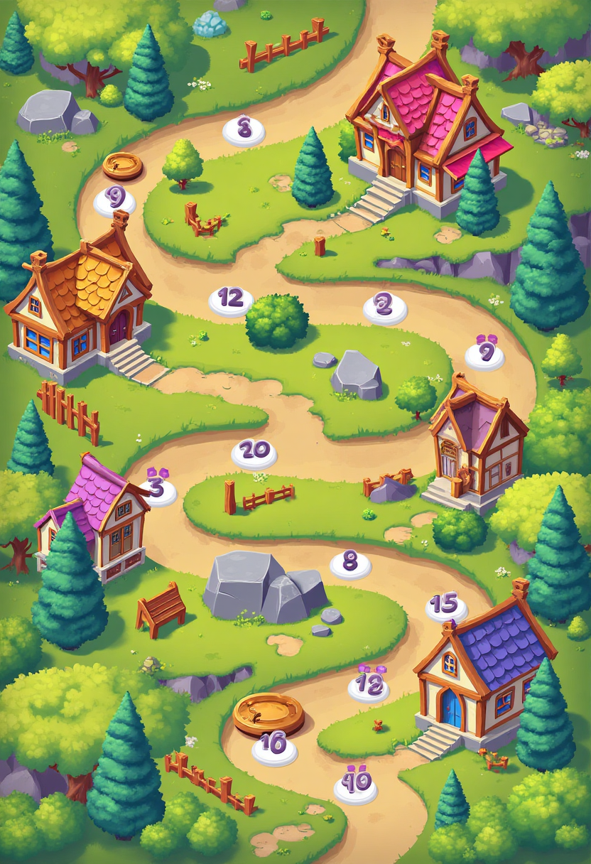 레벨 기반 게임 맵 디자인, 화려한 색상, 구불구불한 길, 귀여운 건물, 마법의 숲 모험처럼, 번호가 매겨진 체크포인트 포함.