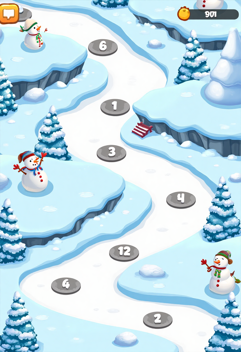 레벨 기반 게임 맵 디자인, 눈 덮인 땅, 흰 길, 얼음 레벨, 귀여운 눈사람, 레벨 번호.