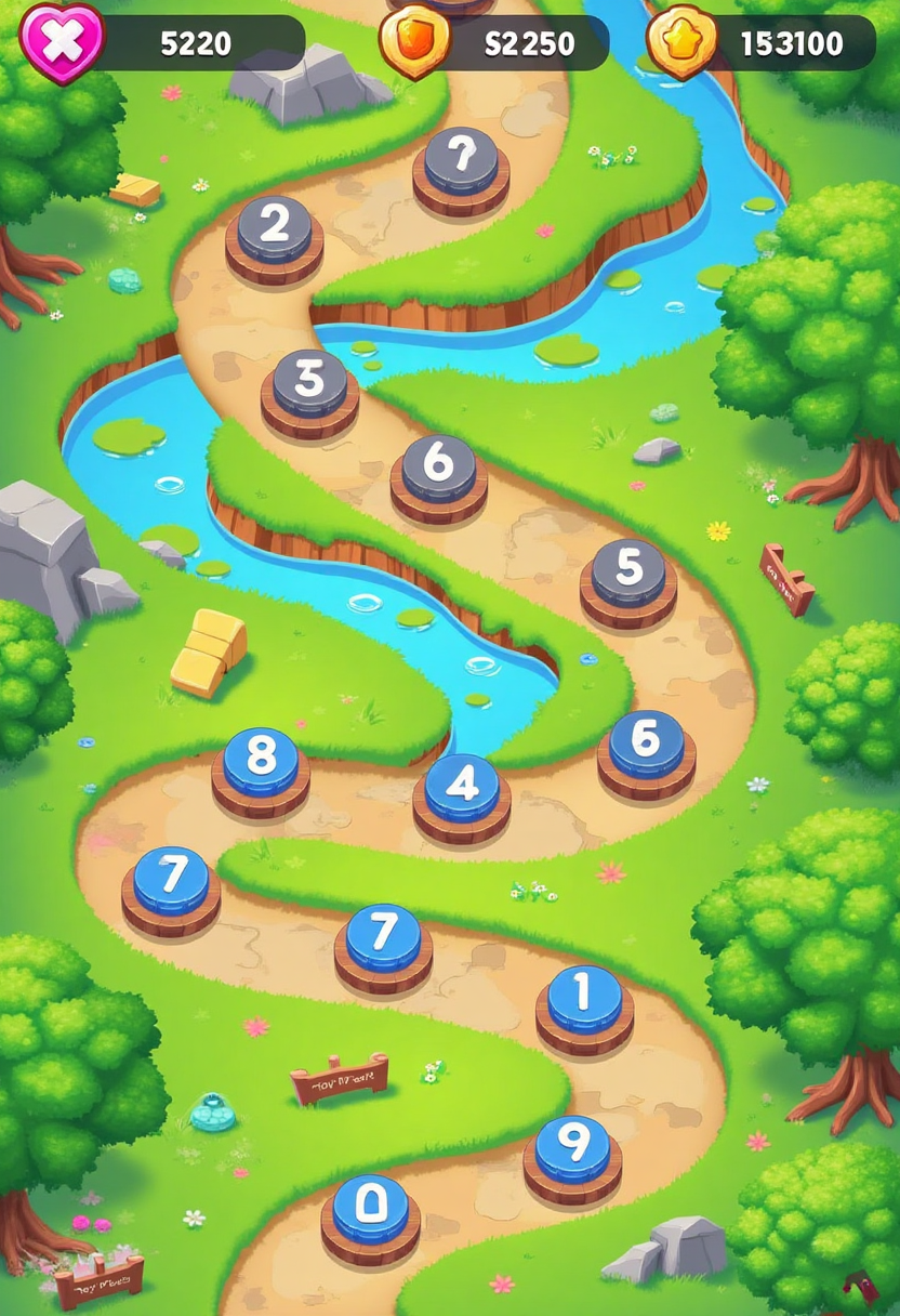 레벨 기반 게임 맵 디자인, 강 건너기 테마, 구불구불한 물길, 풀로 된 길, 화려한 레벨, 간단한 UI.