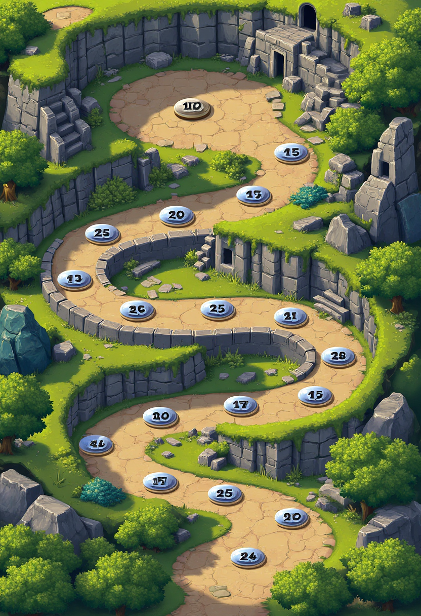 레벨 기반 게임 맵 디자인, 고대 유적 스타일, 돌 길, 푸른 식물, 신비로운 분위기, 번호가 매겨진 레벨.