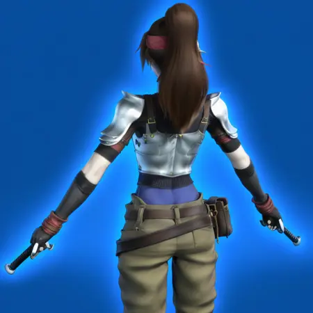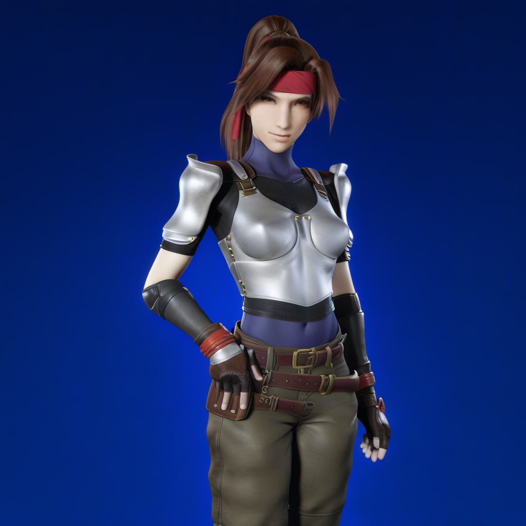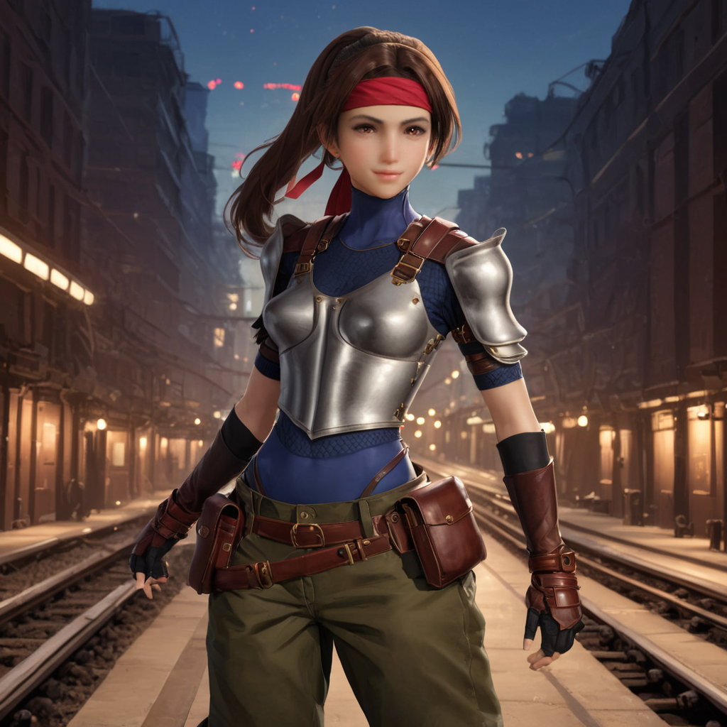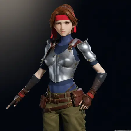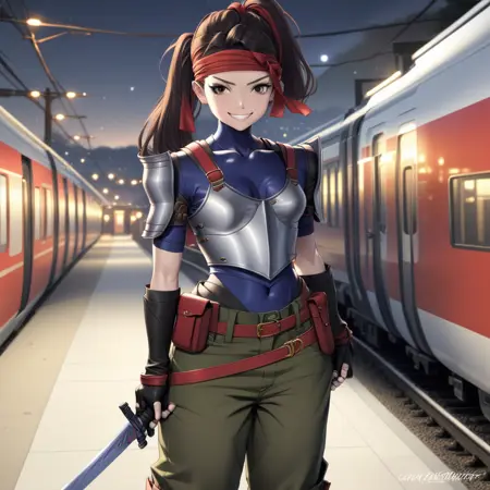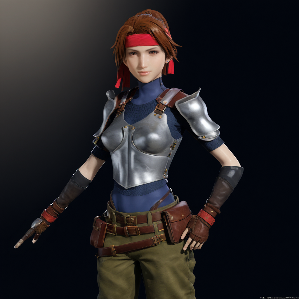 | 训练词汇 | jessieff7 已复制! chestnut brown hair , long and tied into a low ponytail, red headband, brown eyes, metallic breastplate armor over a tight-fitting navy blue undershirt, Armor is practical but fitted, with slight shoulder guards, fingerless gloves, elbow-length sleeves, utility belt and hip pouches, brown leather straps crossing her hips, dark blue pants, fitted for movement, Reinforced boots 已复制! |
