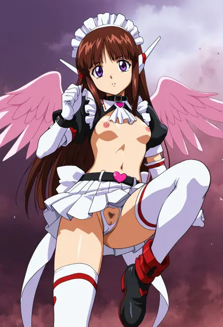 Outfit 04 (Maid Up): nipples, wings, breasts, robot ears with wings, maid headdress, (power-up:1.1), black belt collar with white frills and white ascot, white elbow gloves with red accents and pink heart on sleeve, ,,, frilled white thighhighs, crotch cutout, exposed crotch, navel, frilled puffy short sleeves, revealing clothes, (front waist heart accessory with white side wings:1.2),,,, female pubic hair, white with red accents ankle boots with pink heart, white pleated skirt with missing front,