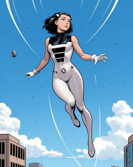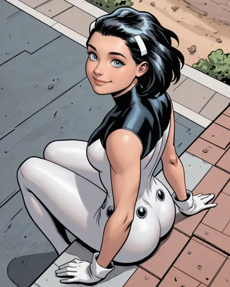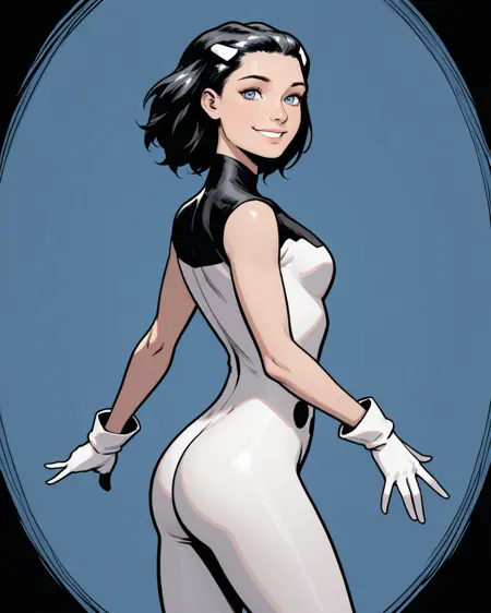 Triggers: tinya, 1girl, black hair, hairclip, white gloves, bodysuit, sleeveless