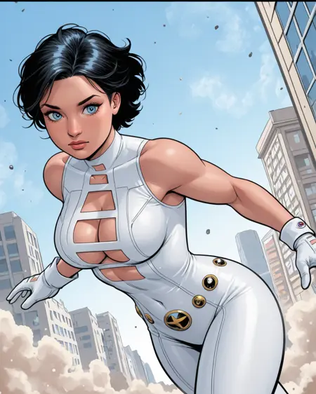 Alternate: tinya, 1girl, black hair, blue eyes, short hair, cleavage cutout, clothing cutout, breasts, white gloves, bodysuit, sleeveless