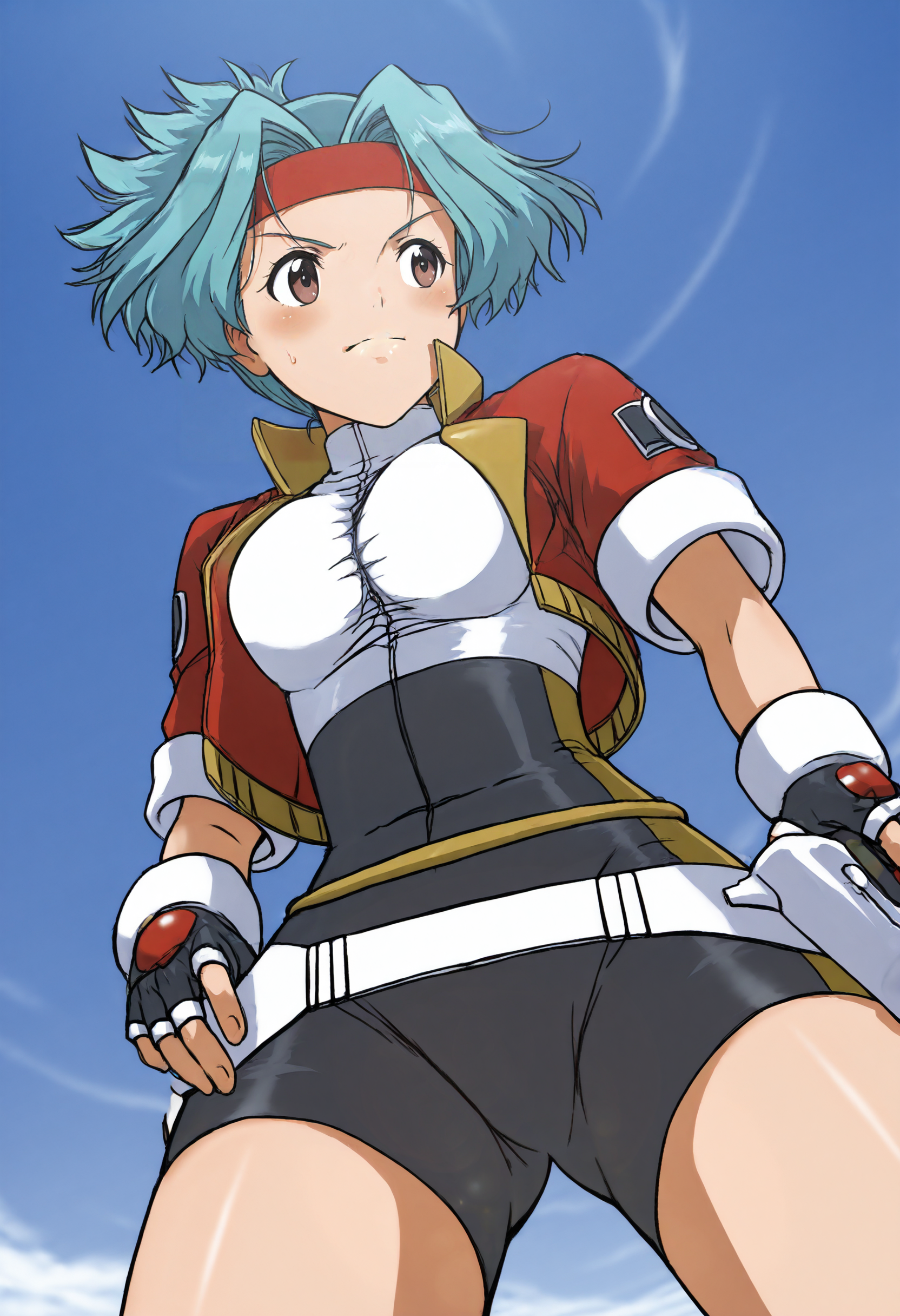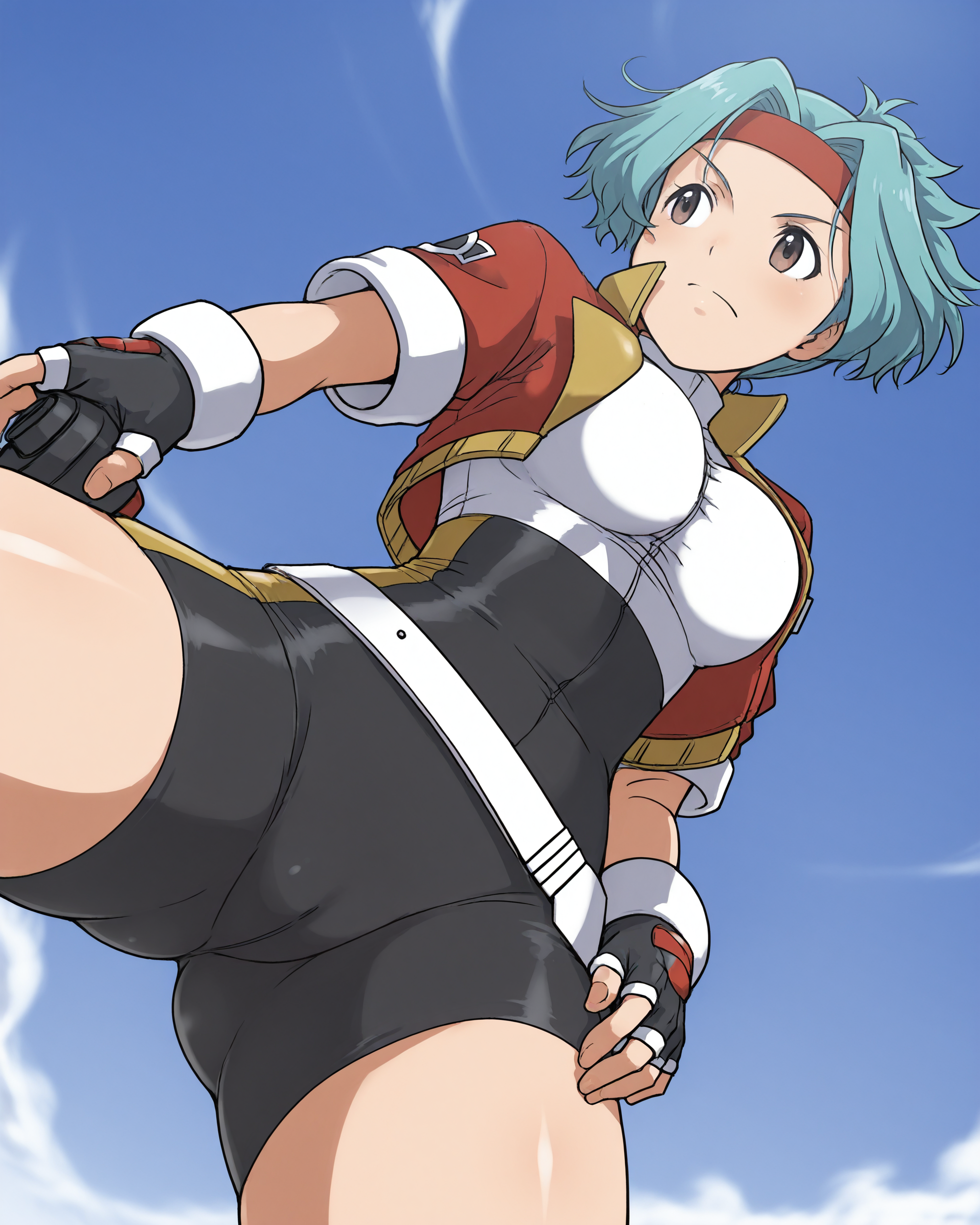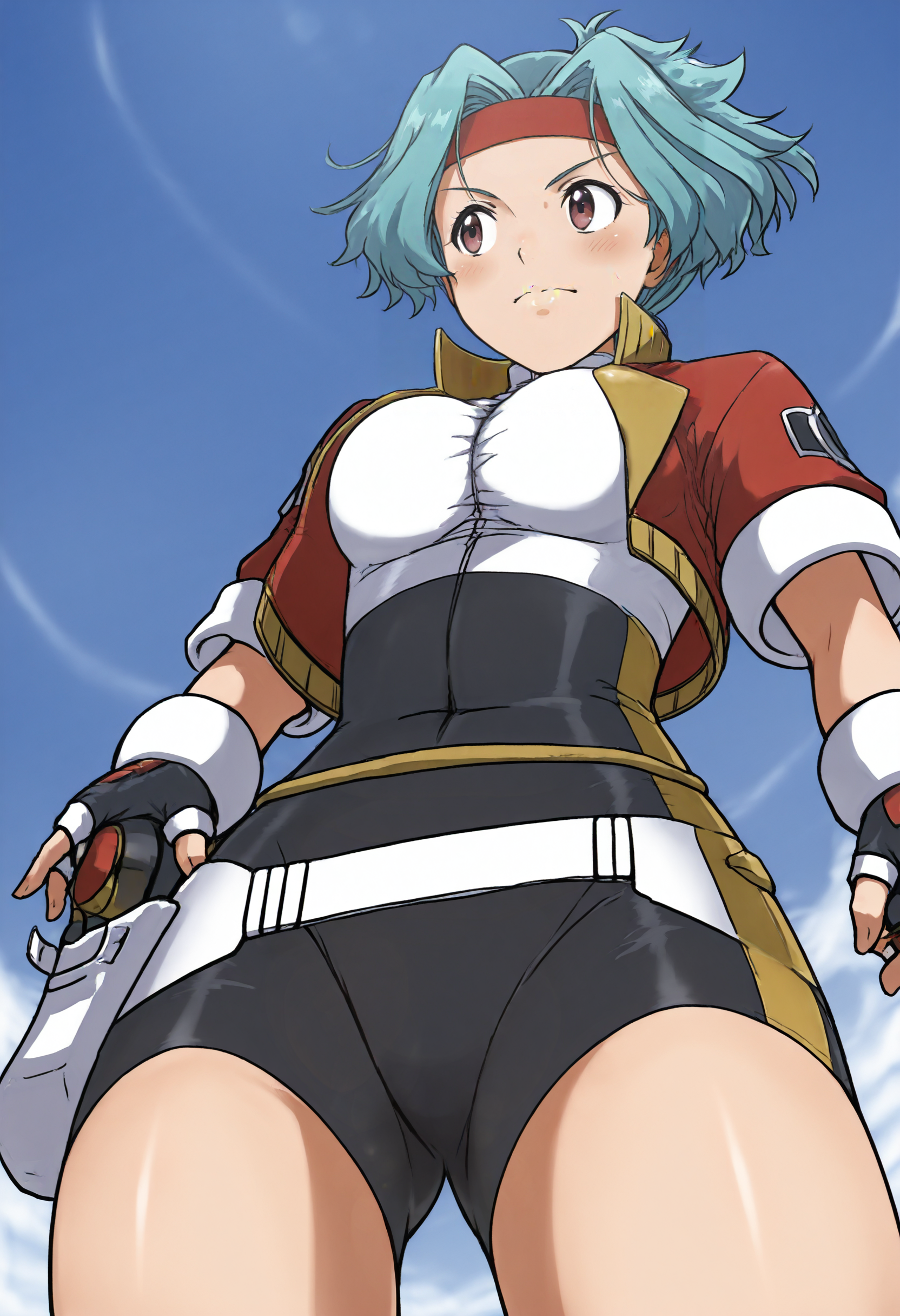 solanahinata,1girl,1girl,单人,手套,短发,露指手套,发带,骑行短裤,蓝发,紧身衣,棕眼,腰带,夹克,天空,从下往上,白天,水色发,杰作,最佳品质,曲线美,维纳斯身材,