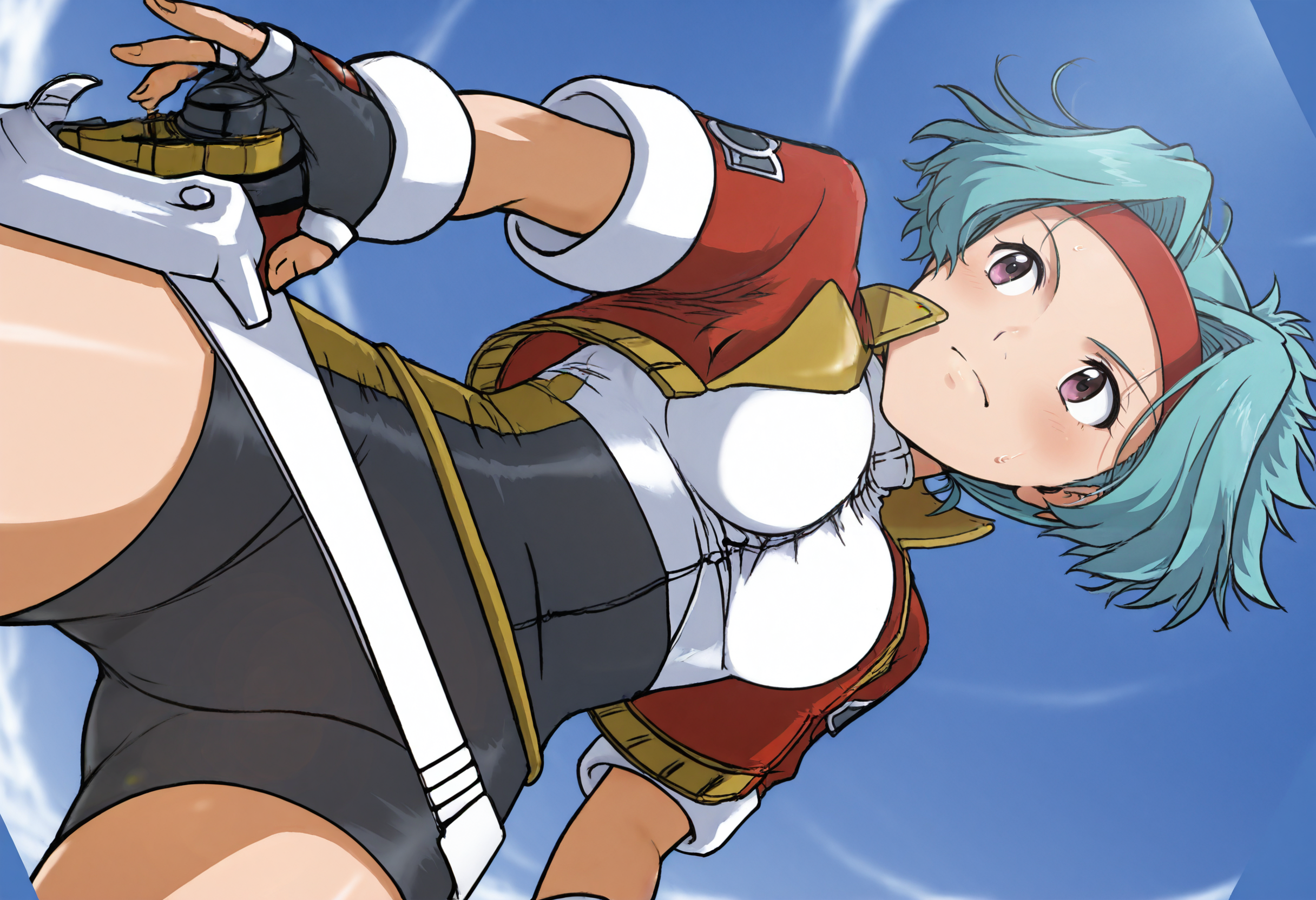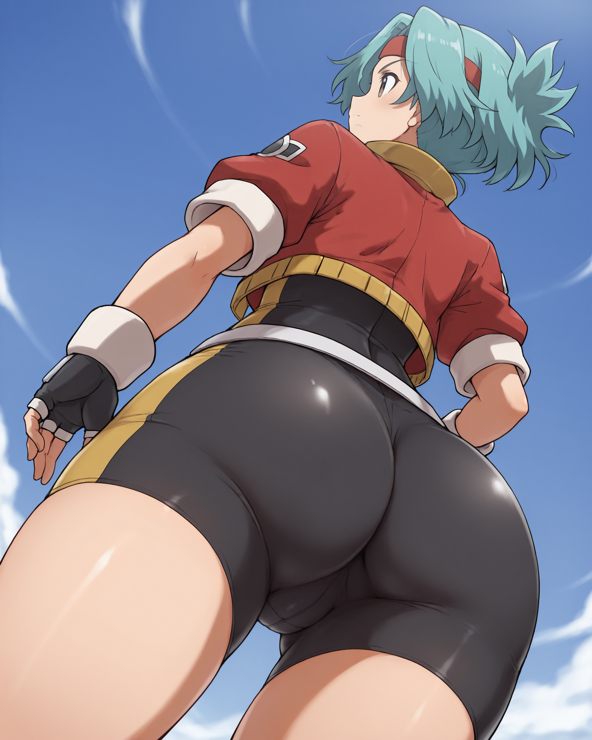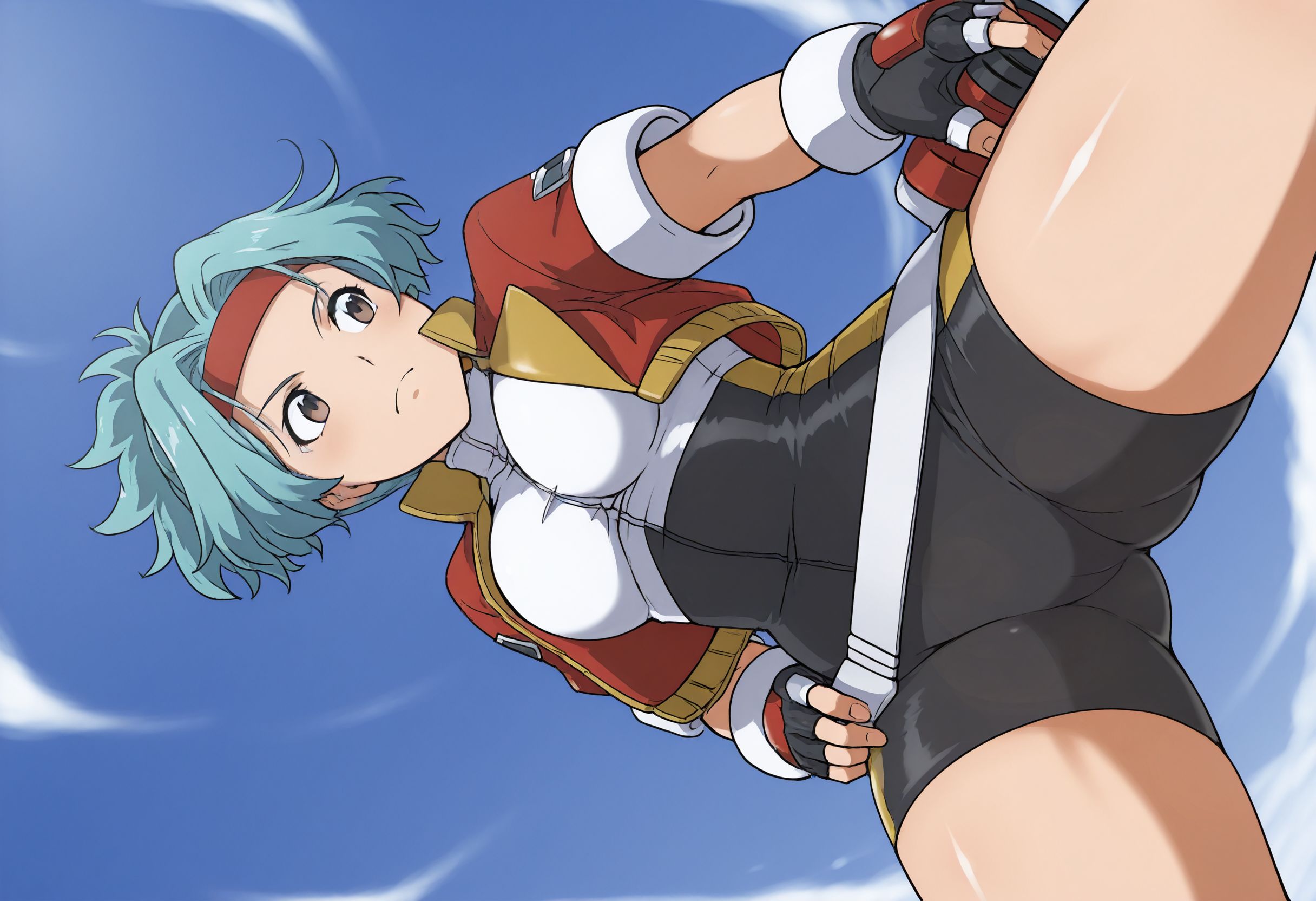solanahinata,1girl,1girl,单人,手套,短发,露指手套,发带,骑行短裤,蓝发,紧身衣,棕眼,腰带,夹克,天空,从下往上,白天,水色发,杰作,最佳品质,曲线美,维纳斯身材,