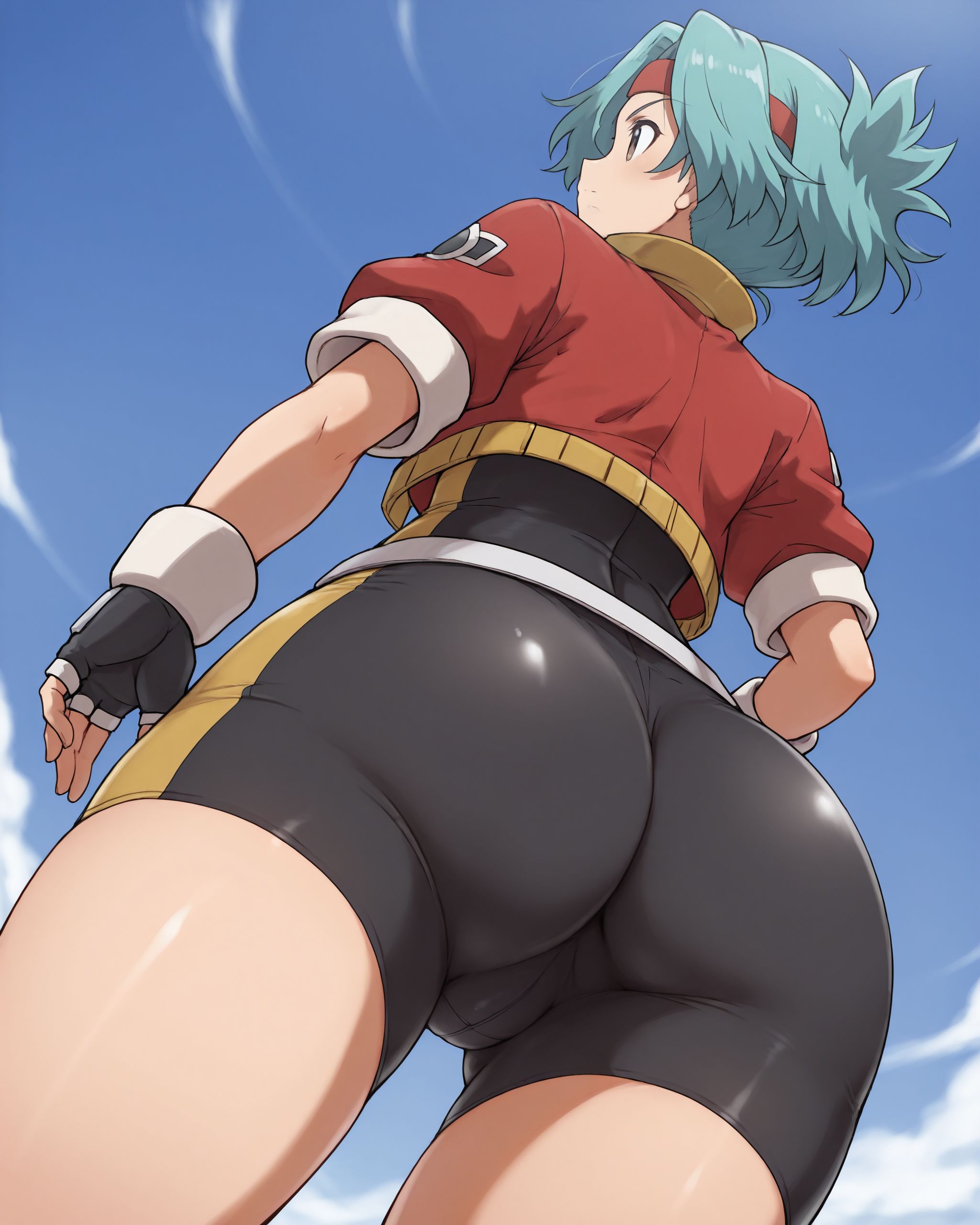 solanahinata,1girl,1girl,单人,手套,短发,露指手套,发带,骑行短裤,蓝发,紧身衣,棕眼,腰带,夹克,天空,从下往上,白天,水色发,双腿分开,身体前倾,臀部,抓臀,1男孩,手套,露指手套,单人聚焦,过膝袜,抓别人臀部,性骚扰,回头望,脸红,汗水,4k,杰作,最佳品质,曲线美,维纳斯身材,荷兰角,