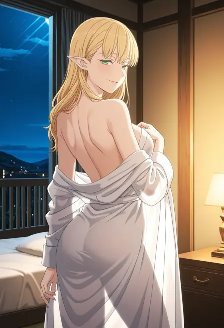 KJOerielf, blonde hair, green eyes, pointy ears, long hair, green leotard, frills, cleavage cutout, detached collar, long sleeves, yellow trim,