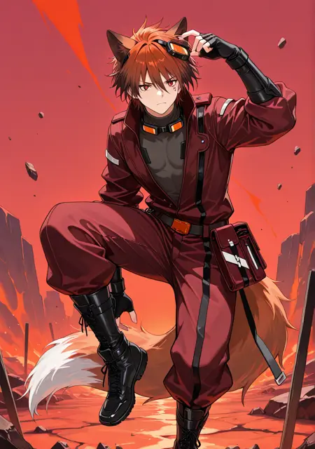 chiave, red_hair, red_eyes, animal_ears, fox_ears, fox_tail, tight_shirt, jacket, goggles, fingerless gloves, multicolored hair, facial_mark, boots,