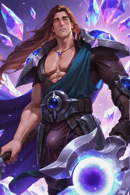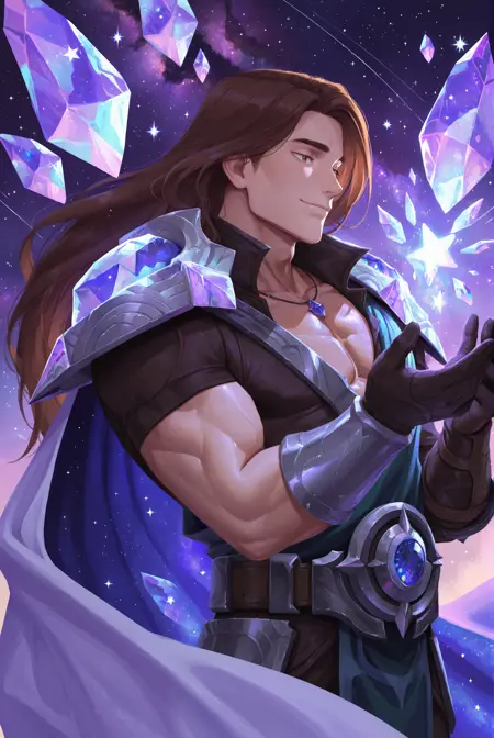 tar1c, long hair, brown hair, muscular, armor, gloves, necklace, cape, jewelry, crystal, floating crystal, shoulder armor, pectorals