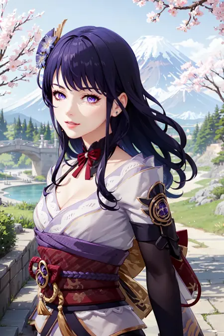 三つ巴(形)、紫の花、紫の着物、紫の太ももハイズ、リボン、