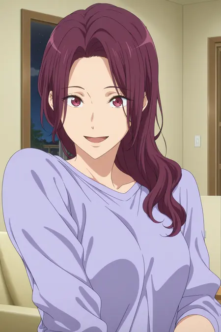 matsuoka miyako, long hair, purple hair, hair over shoulder, parted bangs, purple eyes