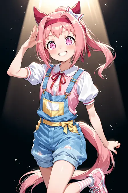 马娘、马尾、马耳、短发、发丝内收、粉发、刘海、粉眼,