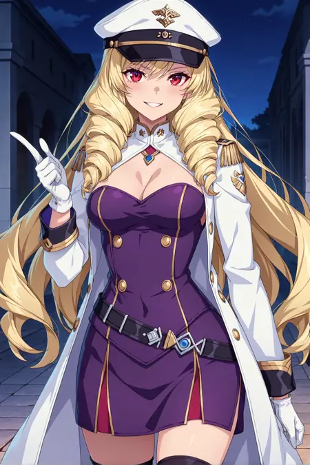 red eyes, blonde hair, drill sidelocks, long hair, white military hat, medium breasts, cleavage, purple dress, white military coat, open coat, white gloves, black thighhigh, high heels
