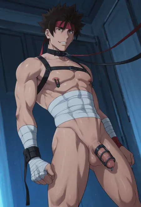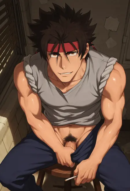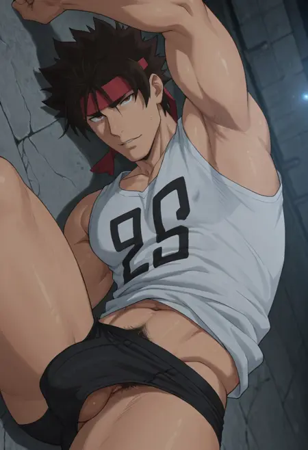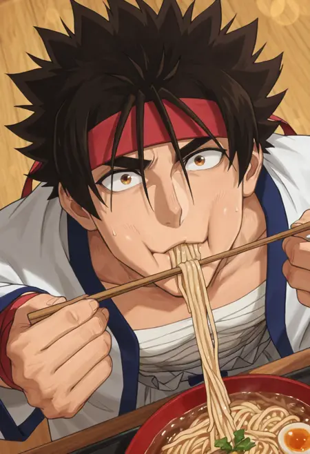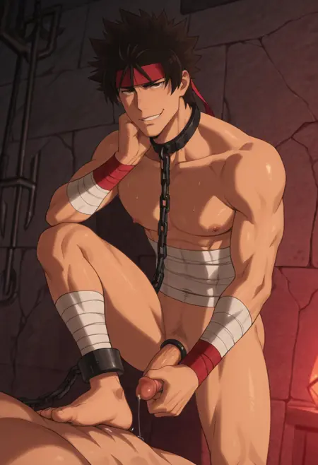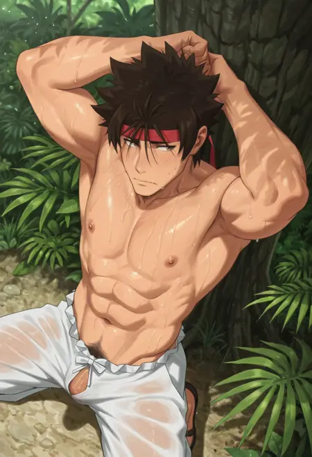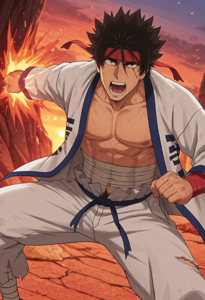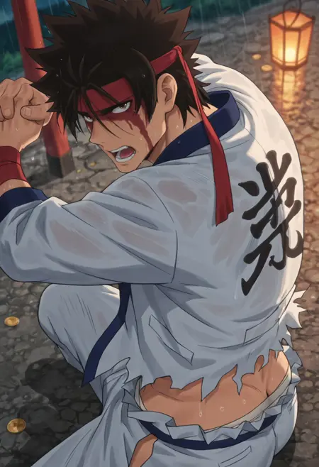 SanosukeRK, SanosukeRK_dark_brown_spiky_hair, SanosukeRK_brown_eyes, SanosukeRK_red_headband, SanosukeRK_white_karate_gi, SanosukeRK_sarashi, SanosukeRK_red_wrists_bandage, SanosukeRK_white_pants