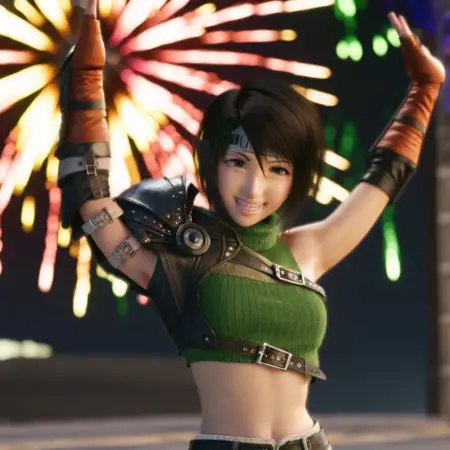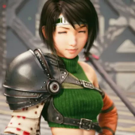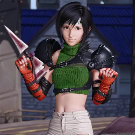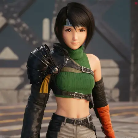 Yuffie Kisaragi from Final Fantasy VII Remake, anime style, energetic young ninja girl, short black hair with jagged bangs, big expressive brown eyes, wearing a green cropped jacket with hood, mesh undershirt, pleated skirt with dark leggings, arm guards and fingerless gloves, oversized shuriken on her back