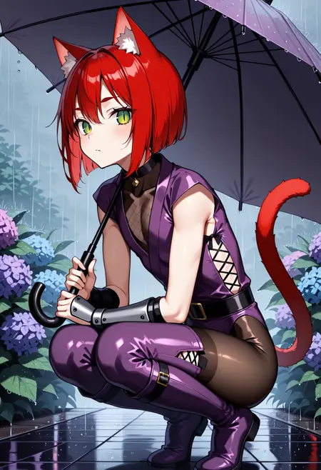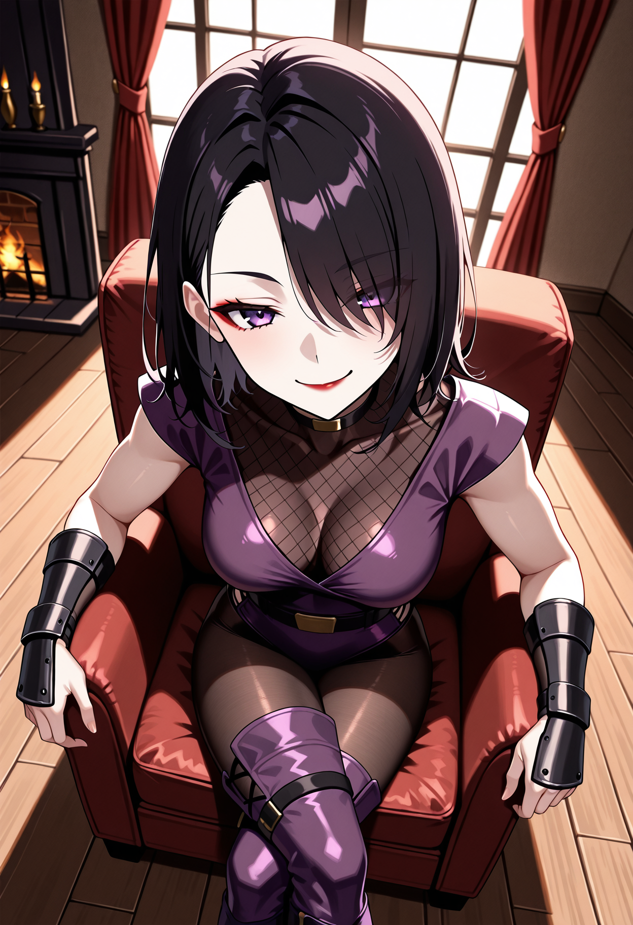 短袖, 紫色紧身衣, 黑色项圈, 护腕, 腰带, 网状紧身衣, 黑色紧身衣, 项圈, 紫色过膝长靴, 超膝长靴, 忍者,