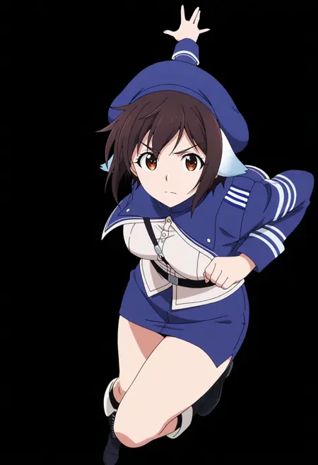 hat, uniform, long sleeves, miniskirt, beret, blue headwear, military, military uniform, knee boots,