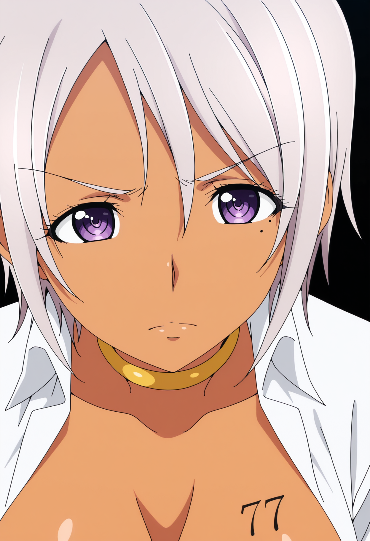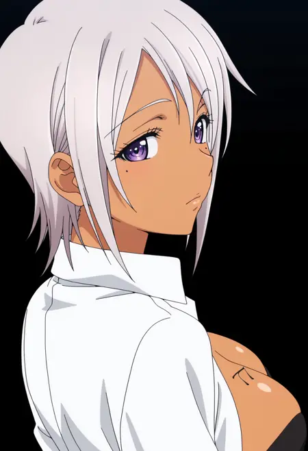 1girl, solo, nana bassler, dark skin, dark-skinned female, short hair, white hair, grey hair, purple eyes, mole, mole under eye, body writing