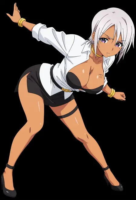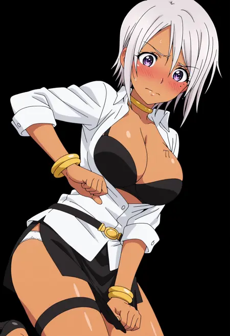 shirt, choker, jewelry, cleavage, open shirt, open clothes, white shirt, bracelet, belt, underwear, black bra, high heels, black skirt, miniskirt, side slit,