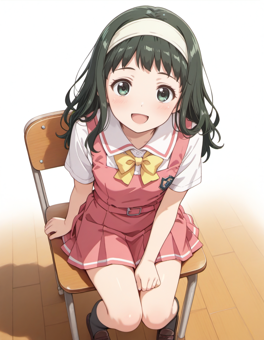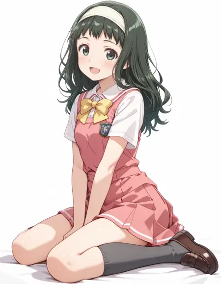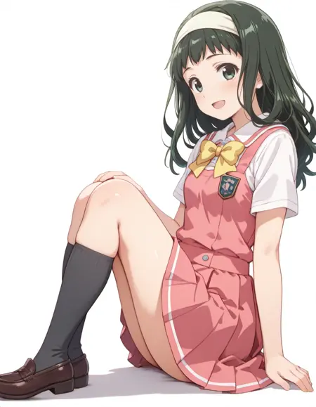 school uniform, pinafore, dark-pink pinafore, short sleeves, ribbon tie, yellow ribbon tie, white shirts, dark-pink skirt, pleated skirt, kneehighs, loafers, dark-gray socks,
