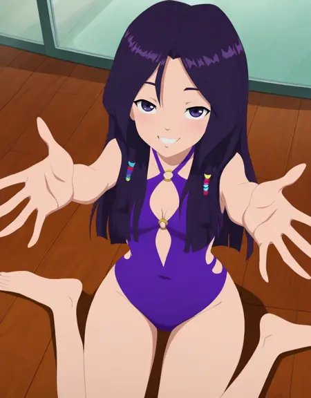 purple swimsuit, one-piece swimsuit, cleavage cutout, clothing cutout