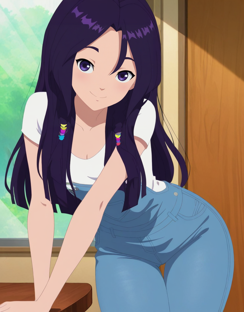 bangs, curvy, hair over shoulder, long hair, purple hair, purple eyes, breasts, small breasts, cleavage